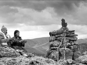 La posizione della macchina da presa, dicevamo, è estremamente importante nel cinema di Catacora, spesso nei campi lunghi essa si posiziona in punti sopraelevati appositamente allestiti, (ripensiamo a Michelangelo Frammartino nel suo Le quattro volte durante la complessa scena della processione, nella quale la macchina da presa era posizionata in un punto che il regista aveva individuato con una precisione tale da costruire un’intera impalcatura per poter averla lì). Una tale chiarezza di intenti presuppone un profondo rigore formale. E il cinema di Catacora lo conferma, oltre a Kurosawa (nella fotografia) e Leone (nell’inquadratura), ravvisiamo echi di Stroheim e del sopracitato Bresson, Il film si sposta da un registro visivo all’altro mantenendo una straordinaria continuità di fondo, data da una fissità di inquadratura e una coerenza di ritmo interno molto scrupolosa. Nei volti dei personaggi si riflette una cultura fatta di tradizioni arcaiche, una comunità che si muove con un codice primitivo e feroce, fatto di punizioni fisiche ed esilianti, che non lascerà scampo a nessuno dei due.