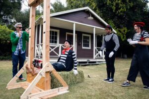 Sbalzati come il capo della combriccola, Knoxville, che prima viene proiettato – a imitare il ‘volo di Icaro’ – da un cannone nelle acque di un lago e poi a lanciarlo è un toro furioso che gli assesta un trauma cranico, un paio di costole rotte e quant’altro. Ma c’è spazio anche per qualcosa di più estremo, come a esempio il gioco del mimo. I nostri eroi dovranno subire in silenzio, chi si lamenta perde: la prima deve testare la carica di un teaser, il secondo baciare la testa di un crotalo adamantino («è velenoso? / Ehmm»), il terzo ricevere uno skateboard sulle gambe a mo’ di ghigliottina. Si lascia l’interrogativo su chi sia lo sconfitto, e no, probabilmente non avete indovinato.