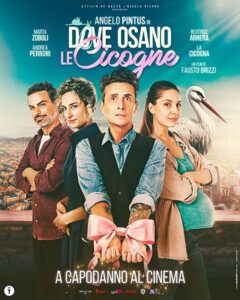 Partiamo dal primo film. Dove osano le cicogne è il diciassettesimo film del regista romano Fausto Brizzi (1968), emerso – lo si ricorderà – una ventina d’anni fa con Notte prima degli esami (2006) e suo relativo sequel, l’anno successivo. Il film tratta di una coppia, composta da soggetti non più giovanissimi, interpretati da due celebri comici televisivi, ovvero Angelo Pintus (1975) e Marta Zoboli (1978) – e come già nel caso di Angelo Duro, anche qua i personaggi recano gli stessi nomi degli attori, dunque Angelo e Marta, al fine, per così dire, di richiamarsi al brand. La coppia vorrebbe procreare, ma i problemi, lo scopriamo strada facendo, soprattutto della donna (affetta da endometriosi) non lo permettono. Dopo infiniti tentativi, decidono di andare a Barcellona a cercare una donna disposta a farsi carico della gravidanza con gli ovuli di Marta fecondati dallo sperma di Angelo. La fanciulla spagnola, anzi catalana che risponde al nome di Luce (interpretata dall’italianissima Beatrice Arnera) segue i protagonisti a Milano, trasformando non poco la loro esistenza anche grazie a una serie di colpi di scena che non rivelerò se qualcuno volesse vedere il film, reperibile su Netflix. In un panorama comico, come si è visto, non particolarmente esaltante, va segnalata l’ambizione degli sceneggiatori (5 in tutto, fra cui Brizzi e Pintus) di toccare un argomento scabroso, divenuto nei mesi successivi alle riprese ancor più drammatico, vista la decisione del governo Meloni di perseguire come reato universale (legge del 16 ottobre 2024) la gravidanza eterologa. Sul piano attoriale si lasciano nettamente preferire i personaggi minori: Tullio Solenghi, ex colonnello dei carabinieri, che interpreta il padre di Marta e che è costantemente, anche da pensionato, in cerca di reati, con un particolare accanimento nei confronti del genero; il veterano Antonio Catania, nel ruolo del preside della scuola in cui lavora Angelo; la suocera Imma Piro, storica attrice napoletana, cresciuta alla scuola di Eduardo; Maria Amelia Monti nel ruolo di una ostetrica new age. Il film è a tratti parecchio stiracchiato con scene decisamente riempitive, ma tutto sommato si lascia vedere. Trovo che il suo principale difetto sia l’incapacità di caratterizzare in modo plausibile la collocazione sociale dei personaggi, che vivono sui Navigli (una delle zone più care di Milano, anche se viene detto che hanno un mutuo) e fanno l’uno il maestro elementare e l’altra la psicanalista. Il primo vira il proprio mestiere in modo totalmente macchiettistico, la seconda si vede una sola volta esercitare in una seduta online, e francamente appare poco credibile. Mi pare che in generale la commedia italiana sia del tutto incapace di raffigurare l’Italia, con i suoi mestieri e le sue professioni. Vi sembrava credibile ad esempio Edoardo Leo, professore di filosofia, in FolleMente? Per non parlare delle “professioni” esercitate dai laureati nella serie Maschi veri, produzione Netflix, di cui ho già avuto occasione di parlare.