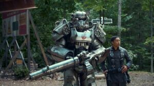 Ciò che connota fortemente la saga videoludica, e che, lo diciamo subito, è stato perfettamente riprodotto in questa serie tv (e per la quale è stato dedicato gran parte del budget) è la peculiare atmosfera che permea l’universo, un setting retro-futuristico con elementi fortemente nostalgici appartenenti ad un’estetica anni ’50, accompagnati da tecnologie robotiche ultra-avanzate. Quella di Fallout è una società idilliaca in cui l’energia atomica non è un’arma, ma una fonte di energia quasi illimitata. Una società che cita la cultura del dopoguerra degli Stati Uniti degli anni ’50, sorridente ed estasiata: Il sogno americano impresso a forza da motivetti spensierati, arredamenti, una rassicurante voce radiofonica, tutto questo crea un contrasto straordinario con la desolazione, la violenza, la brutalità, la rovina ed il degrado del paesaggio esterno. Una contrapposizione che si tramuta in cifra stilistica, ed è uno degli elementi che ha reso Fallout una delle saghe più riconoscibili di sempre.