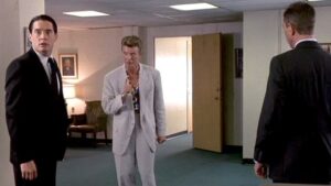 La morte e la violenza restano qualcosa di perturbante e pericoloso, anche se non se ne rimuove la connessione con le zone opache e invischianti dell’erotismo e del desiderio. Una tensione attrattiva e respingente al tempo stesso, che si concretizza nella scelta tra il vedere e il non vedere, e non solo relativa al soggetto che agisce l’atto, ma anche a ciò che lo riceve e lo restituisce mutato. Seguendo questo ragionamento è emblematica la sequenza, sempre nel prologo, dell’apparizione e della sparizione lungo i corridoi degli uffici dell’ FBI della figura di Philip Jeffries, portato in scena dalle sembianze quanto mai enigmatiche, ambivalenti e mitologicamente pop di David Bowie. Un momento nascosto e rivelato, un Easter Egg del labirinto ludico lynchiano, che porta però con se, almeno a livello figurativo, la rappresentazione della “loggia” e dei suoi personaggi (tra i quali l’ormai iconico nano danzante): sarebbe scorretto definirlo un non luogo, vista la materialità tattile e l’udibile distorsione sonora che ne caratterizzano l’ingresso in entrata e in uscita; si tratta invece di un luogo altro, parallelo, sovrapposto come un’interferenza che interrompe il fluire di ciò che accade e ne cambia, oppure ne cela diremmo nel caso specifico, il significato, nel sincretismo e nella ripetizione di passato, di presente e di futuro.