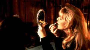“Non voglio parlare di Judy”, dice Jeffries/Bowie, il che equivale a dire che non vuole ricordare e di conseguenza vedere; eppure noi lo vediamo, ma non ascoltiamo, raccontare ciò che ha visto dentro la loggia, trasformata in dispositivo insieme remoto e prossimo di sguardo oltre la facciata visibile della realtà. Successivamente sarà la stessa Laura a porre la questione di sostenere la visibilità/ invisibilità dei fenomeni extra percettivi nei quali si imbatte, come se in qualche modo, sul piano del racconto, fosse lei stessa ad indagare su chi sarà l’autore del suo assassinio a venire. Cosi, spinta dalla necessità inquieta di decifrare il messaggio codificato di due dei membri della loggia (la signora anziana e il bambino con la maschera a forma di un fallico naso), la ragazza si precipita a casa e, nell’alternanza tra soggettiva e controcampo, scorge dietro l’angolo della porta della propria stanza la presenza del selvaggio e urlante Bob. E come se anche noi fossimo, assieme a Laura, fuori e dentro noi stessi, veniamo inghiottiti dall’antro della sua bocca e della sua gola in primissimo piano. Il rituale del delitto su questa terra non potrà poi che avere come perimetro transizionale il laido locale notturno situato al confine tra gli stati (inteso non solo dal punto di vista geografico…) frequentato da Theresa e da Laura, entrambe date in pasto agli sbavanti avventori.
