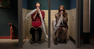 La nozione di colpa e quella di identità serpeggiano tra i fili di una estetica da film noir dai contrasti forti (costumi dai vistosi colori primari) coreografato da Charlie Chaplin nei panni di Charlot (molte le gag che tornano in mente), Buster Keaton e molto cinema muto. L’opera è stata presentata in apertura al Festival di Locarno 2023. La coppia di autori Abel e Gordon si confermano sapienti manovratori di pensiero sofisticato e di messa in scena tra il teatrale e il surreale.