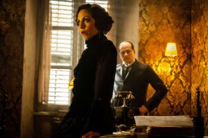Gesto e immagine condizionano Mussolini, un novello Ernesto Rossi non più sul palcoscenico ma in quadro, e questa coppia di significazione si amalgama costantemente allo spazio, al contesto, al mondo circostante. Pensiamo ai primi episodi, prima della Marcia su Roma, in cui la messinscena ci presenta da un lato una Milano buia, sporca e pericolosa, con le osterie sudice e i palazzi pericolanti, in cui il protagonista si muove, tra impalcature in legno che ricordano le iperboli visive dei quadri di Escher; e dall’altro la Milano bene, quella della Sarfatti, che richiama i quadri di Sironi, di Balla, con le forme futuriste e le vampe, vampe, vampe di Marinetti. Come le impalcature, nella costruzione di Joe Wright, segnalano il contorto gioco di potere e il tradimento del socialismo da parte di Mussolini, così le pareti bianconere della casa di Margherita Sarfatti forniscono ordine, disciplina alle azioni del figlio del fabbro. La donna sarà infatti, storicamente, il secondo nucleo-umano che Mussolini vampirizzerà, dopo la socialista Angelica Balabanoff, per entrare in società, nei salotti e impastare al meglio la sua precaria ideologia.