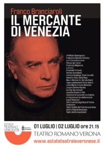 Alle spalle mattonato grigio fumo, sotto i piedi pavimento lucido. Lucido che sa tanto di specchio d’acqua alta e riflesso annacquato di personaggi che saltano da una panchina all’altra per evitare il bagno, lucido per far danzare lanterne nell’oscurità del teatro romano di Verona. Perché Venezia è oscurità opulente. È canali e calle. Finestre che si aprono lassù, bocche di scena che si aprono quaggiù con siluette di corpi curvi, ombre cinesi si affacciano sul palcoscenico e marcano la presenza. Quella del diavolo, quella dell’ebreo, Shylock, ma soprattutto di Franco Branciaroli.