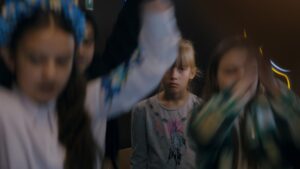 Eppure, niente è normale in un paese mobilitato per lo scontro diretto, e Gornostai rivela i diversi modi in cui gli ucraini si sono adattati da quando la Russia li ha invaso nel febbraio 2022. Le lezioni scolastiche più vicine alle linee di battaglia vengono tenute tramite programmi informatici a distanza, mentre quelle più lontane possono provare a continuare in modo ordinario, anche se spesso vengono interrotte dalle sirene antiaeree che costringono tutti a nascondersi sottoterra. In una sequenza, un insegnante d’arte ha trasformato uno scantinato in uno studio colorato per studenti che imparano a dipingere e disegnare. In un’altra città, un’intera banchina di una stazione della metropolitana è diventata una scuola improvvisata, completa di lavagne, banchi e materiale didattico. Dato che la guerra dura ormai già da molto tempo, i bambini sembrano come abituati alla situazione, anche se non mancano purtroppo i drammi che influenzano le coscienze anche dei più piccoli. Gornostai e il cameraman Oleksandr Roshchyn catturano questi momenti in riprese widescreen composte con armonia, piene di figure giovani, che si tratti di bambini in età prescolare che corrono verso un rifugio antiaereo o di adolescenti che tirano a canestro in una palestra parzialmente distrutta da un attacco missilistico. La colonna sonora orchestrale e corale di Alexey Shmurak aggiunge una qualità epica a tali immagini, come se stessimo assistendo alla nascita di una nuova nazione che risorge come una fenice dalle proprie ceneri.