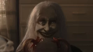 Sul piano registico l’epifania di Judy da nascitura morta-a bambina terrorizzata e tenuta nascosta dal principio paterno/materno di controllo-a donna che affronta e guarda in faccia l’orrore è reso in un ‘alternarsi di occhi aperti e chiusi, di apparizioni e sparizioni iconiche (la bambola Annabelle, un po’ il prequel, cronologicamente parlando, di tutta la saga fa il suo inquietante capolino), di filastrocche recitate pensando, infantilmente, di spezzare la catena di spavento e persecuzione; un mantra, al contrario, che alimenta il processo regressivo di Judy e la mette in una condizione di maggiore vulnerabilità verso il demone che si nutre della sua paura immaginativa, onirica e mnemonica ( nulla di nuovo comunque, se si pensa al Freddy Krueger del wescraveniano Nightmare-Dal profondo della notte, anche se in quel caso si trattava, in maniera più perturbante, di inconscio, pulsioni e colpa). E la sequenza di lei vestita da sposa, in un camerino circondato da specchi che ne moltiplicano l’immagine e la frammentazione dell’io in una situazione che invece dovrebbe riportarla alla compattezza, alla solidità e alle radici, con tanto di demone strega che si infila sotto la voluminosa gonna in una non velata allusione sessuale, sorprende e lascia il segno. Certo, rispetto a due ore di film antologico, con i soliti jumpscares, gli oggetti che si rompono e si ricompongono, i corpi che vengono scaraventati da una parte all’altra (con il rischio del comico involontario dietro l’angolo) e soprattutto la famiglia, raddoppiata e triplicata, minacciata ma sempre in grado di resistere, di sopravvivere, di uscire segnata sulla pelle e illesa nella sostanza.